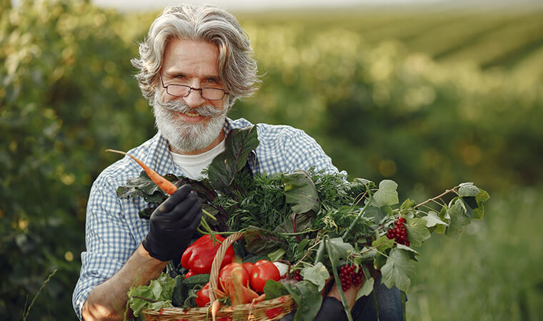 Old Farmer CloseUp Holding Basket Vegetables